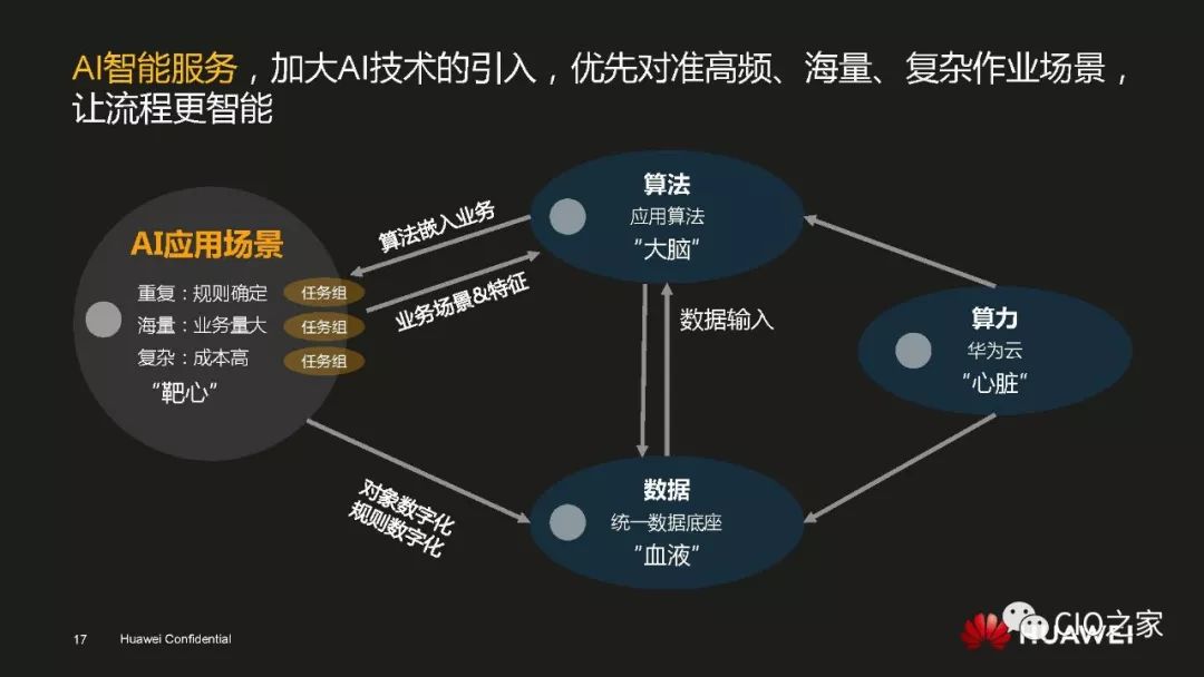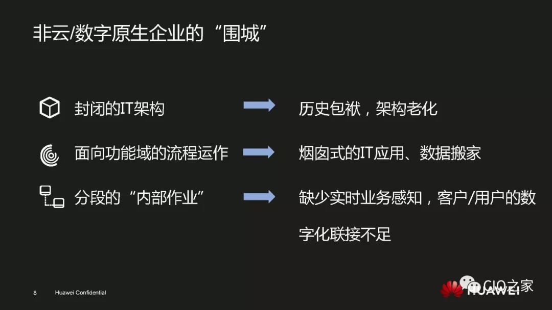 数字化转型绝不是简单的技术驱动,一定是技术和业务的双轮驱动。所以数字化转型想要顺利进行就一定要让业务主管明白其重要性和必然性,也就是要回答业务主管“为何要变”的问题。华为之所以能够在业务上取得飞速的发展,是因为华为的产品和服务在当下的环境中属于行业标杆。但基于旧有IT系统,华为是无法保持这一领先地位的,因此,数字化转型才是华为发展的必经之路。既然让用户满意度和生产效率成为行业标杆是业务主管的责任,那么推动数字化转型也同样是业务主管的职责。