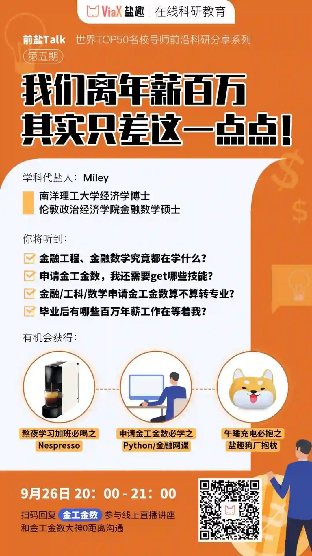 为了帮助像酷盖刘一样的同学,ViaX盐趣特别请到伦敦政经学院金融数学硕士,南洋理工大学经济学博士Miley导师,担当本次的学科带盐人,为大家扫清疑虑,找到提升申请成功率的方法!