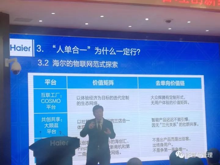 今天因时间的关系主要讲三点。第一个是,为什么一定要颠覆传统的模式;第二个就是,为什么一定是“人单合一”。我不是说“人单合一”是唯一的,但是“人单合一”一定是符合这一个方向的,因为 “人单合一”,人是员工,单不是狭义定单而是广义的,就是用户的需求。把员工和用户的需求连在一起,由员工去创造用户的价值;第三个是,“人单合一”为什么一定会在物联网时代畅通无阻。