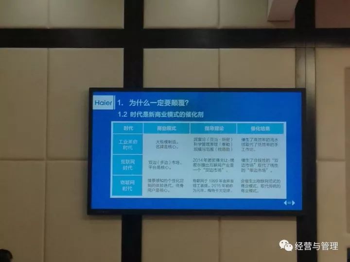第一是对人的定位的颠覆,第二是对组织的颠覆,就是原来的科层制。现在我们说的就是把中层的管理层都去掉之后,海尔变成一个创业的平台。现在企业的科层,有的十层,有的八层,我到通用汽车问多少层管理层?他说14层,企业越大层级越多,层级多了之后,互相之间不通;越大,官僚主义越厉害。海尔没有层级,完全变成平台。海尔只有三种人,平台主、小微主和创客。第一种人是平台主,就是你在这一个领域里面能够创造一个什么样的平台,比如说冰箱,平台主是搭建一个全球的冰箱的平台,平台上有创业团队,基本上应该是类似于承担为创业团队服务的任务。