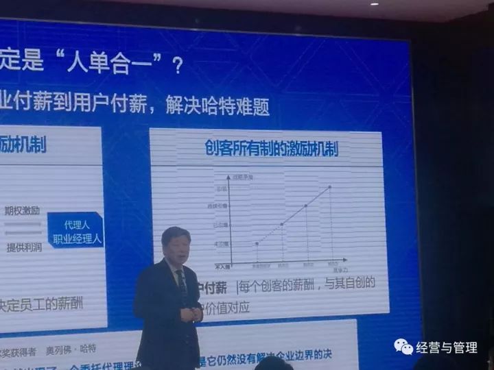 我们也曾经引进美国考核方式KPI,那一套东西真的非常复杂。现在我们企业在薪酬考核上面完全不一样。诺贝尔奖获得者哈特,提出的不完全契约理论,他非常重要的一本书是《企业合同与财务结构》。这一本书有一句话出现了一个委托代理理论分支。现在美国把这一个用的非常多。但是仍然没有解决企业边界的决定性因素这一个基本问题。因为这里面没有解决企业边界的绝对因素,只有横轴,没有纵轴,没有和用户连在一起,没有让用户进入边界里面。而互联网时代最重要的一点就是企业无边界,如果你把企业还当成边界这就不可以。我们的“人单合一”恰恰是完全契约理论。刚刚小帅影院的例子,所有人的控制权和收入权一致。因为引入风投之后,你也可以跟投,获得了2%的股份,将来也是2%。
