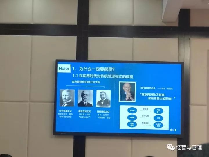 管理大师德鲁克, 被称为大师中的大师的,提出“互联网消除距离,这是他最大的影响”。所以互联网的零距离,把这三位古典管理理论者的先驱理论都给颠覆掉。泰勒体现的就是流水线,流水线非常有效,今天流水线一定会被颠覆,为什么?很简单,流水线的效率带来的是大规模制造,但是今天是要求大规模定制。所以流水线一定会被颠覆,而马克思·韦伯的科层制也会被颠覆,为什么?互联网的零距离带来的是去中心化。没有人是中心,每个人都是中心。所以说过去的科层制有中心,他的上级领导就是他的中心,直属领导是中心,现在每个人都可以是中心,以自我为中心,成为创客、成为小微。