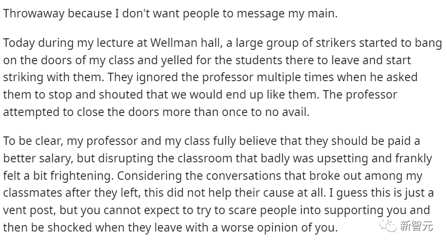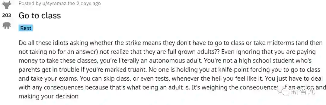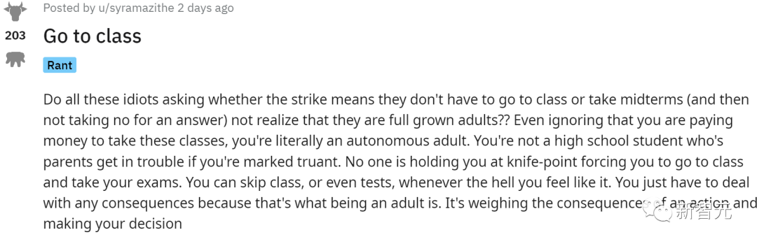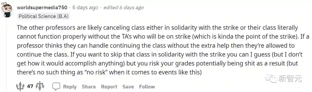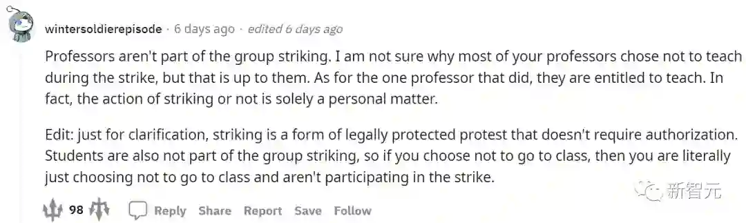 在Reddit上,有人发帖询问:「几乎所有课的教授们都选择停课来支持罢工,只有一位还要上课...我是否必须参与这次罢工,还是说我可以选择呢?如果我想去参加这次罢工呢?」