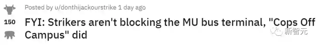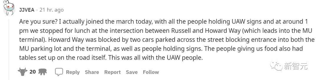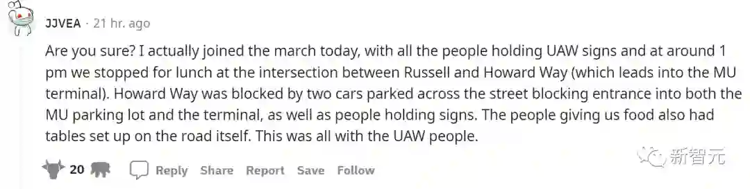 他称:「你确定吗?我参与了今天的游行。那些抗议者举着UAW的标志,用两辆车将学校的公交终点站完全堵死。」