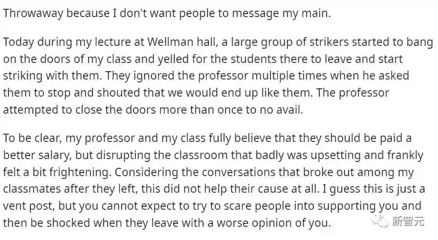 还有一名学生发帖称,自己在上课时遇到抗议人员疯狂敲门,干扰课堂秩序。他愤怒地表示:「这些行径不会让你们的罢工显得更加正义。」