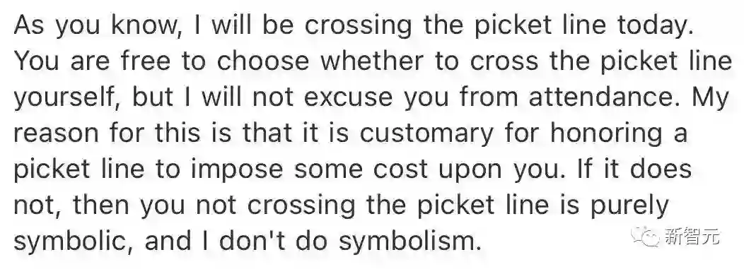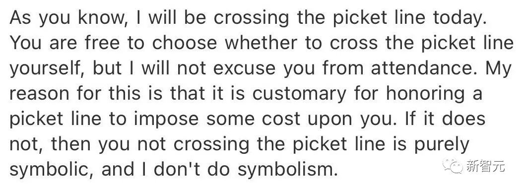 在邮件中,教授说自己打算继续上课。虽然他尊重学生选择上课与否的自由,但他不会接受因「支持罢工」而翘课的借口。