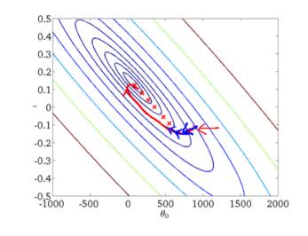 我们可以从图中看出SGD迭代的次数较多,在解空间的搜索过程看起来很盲目。但是大体上是往着最优值方向移动。