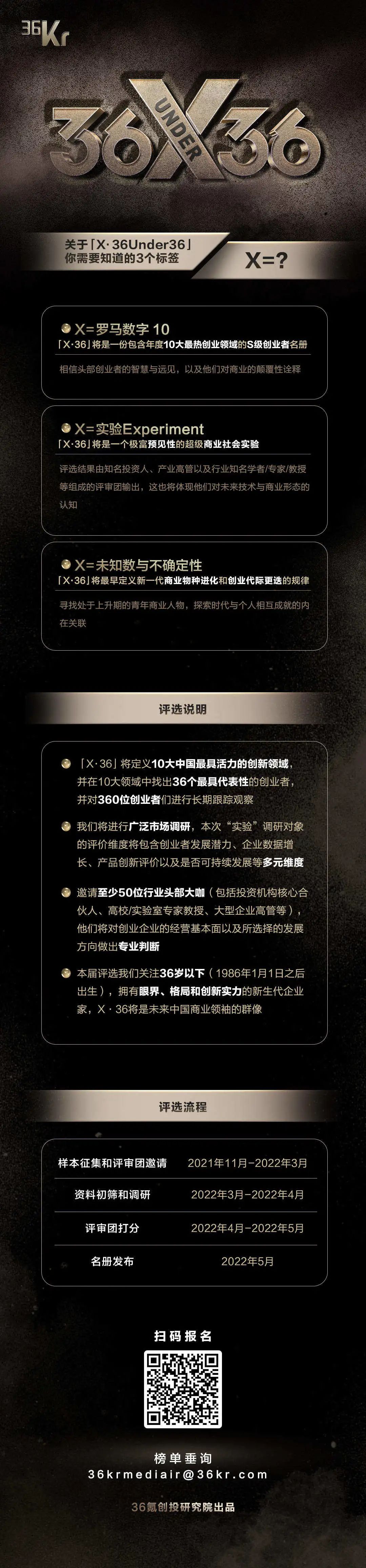 所以我们相信,中国正在、也已经涌现了一批崭新风貌的创业者。去年11月,36氪启动了「X·36under36」征集计划,也正基于这样的前提,我们旨在更早和更大范围地发掘可能伟大的创业者。
