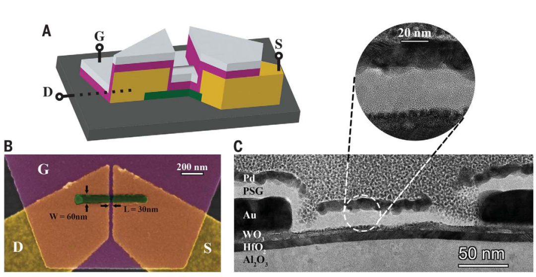 「该设备的工作机制是将最小的离子--质子--电化学插入绝缘氧化物中,以调节其电子传导性。因为我们用的设备非常薄,所以可以通过使用强电场来加速这个离子的运动,并将这些离子设备推向纳秒级操作」论文通信作者、核科学与工程系和材料科学与工程系的Breene M. Kerr教授Bilge Yildiz解释说。