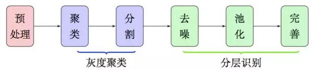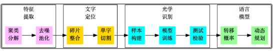 因此,在本文中,我们放弃了边缘检测和腐蚀膨胀,通过聚类、分割、去噪、池化等步骤,得到了比较良好的文字部分的特征,整个流程大致如图2,这些特征甚至可以直接输入到文字识 别模型中进行识别,而不用做额外的处理。由于我们每一部分结果都有相应的理论基础作为支撑,因此能够模型的可靠性得到保证。