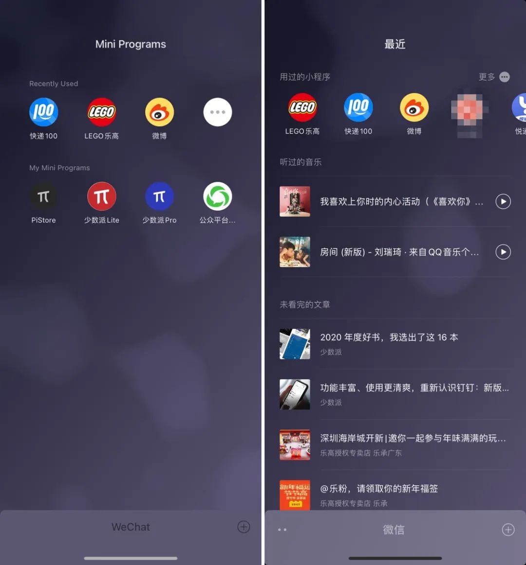 主界面下拉的「小程序」页面变为「最近」页面,新增最近播放的音乐、视频,读过的文章等内容。原先的「我的小程序」被收进了右上角的「更多」菜单。
