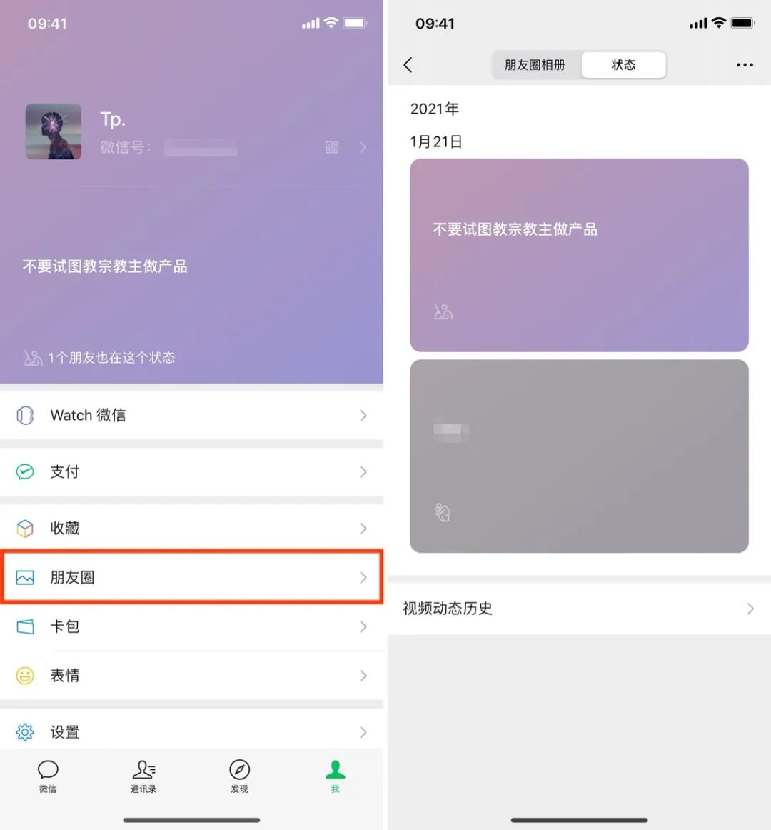 随着「我的状态」的上线,原先占用资料背景的「视频动态」功能则被移除了。你可以在「我 - 朋友圈 - 状态」中找到先前发布过的视频动态,但无法发布新的视频动态。