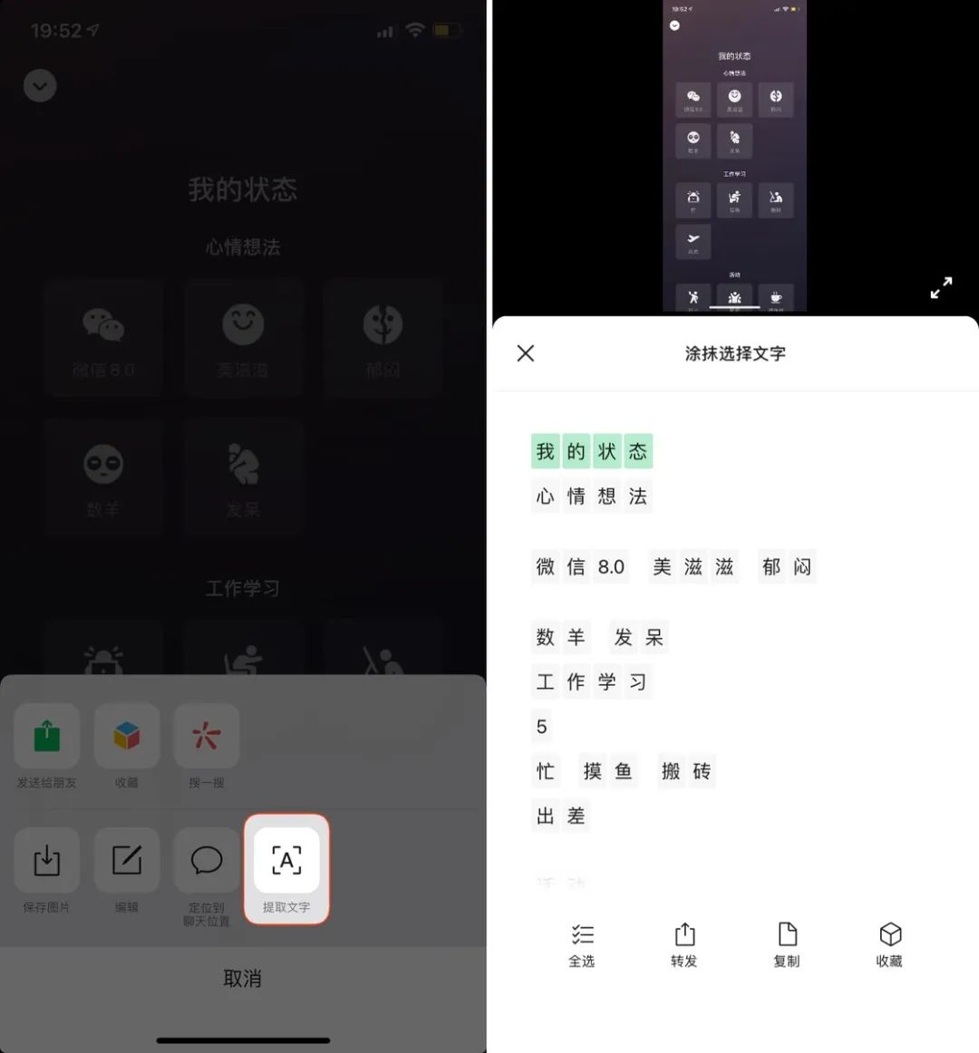 微信 8.0 还有一个不那么显眼的更新:支持提取图片内文字。你只需要长按照片,随后选择「提取文字」就能直接在微信内使用 OCR 做到图片转文字。在实际体验中,文字转换的准确率还是很高的,即使面对中英混排的内容也能很好地识别。