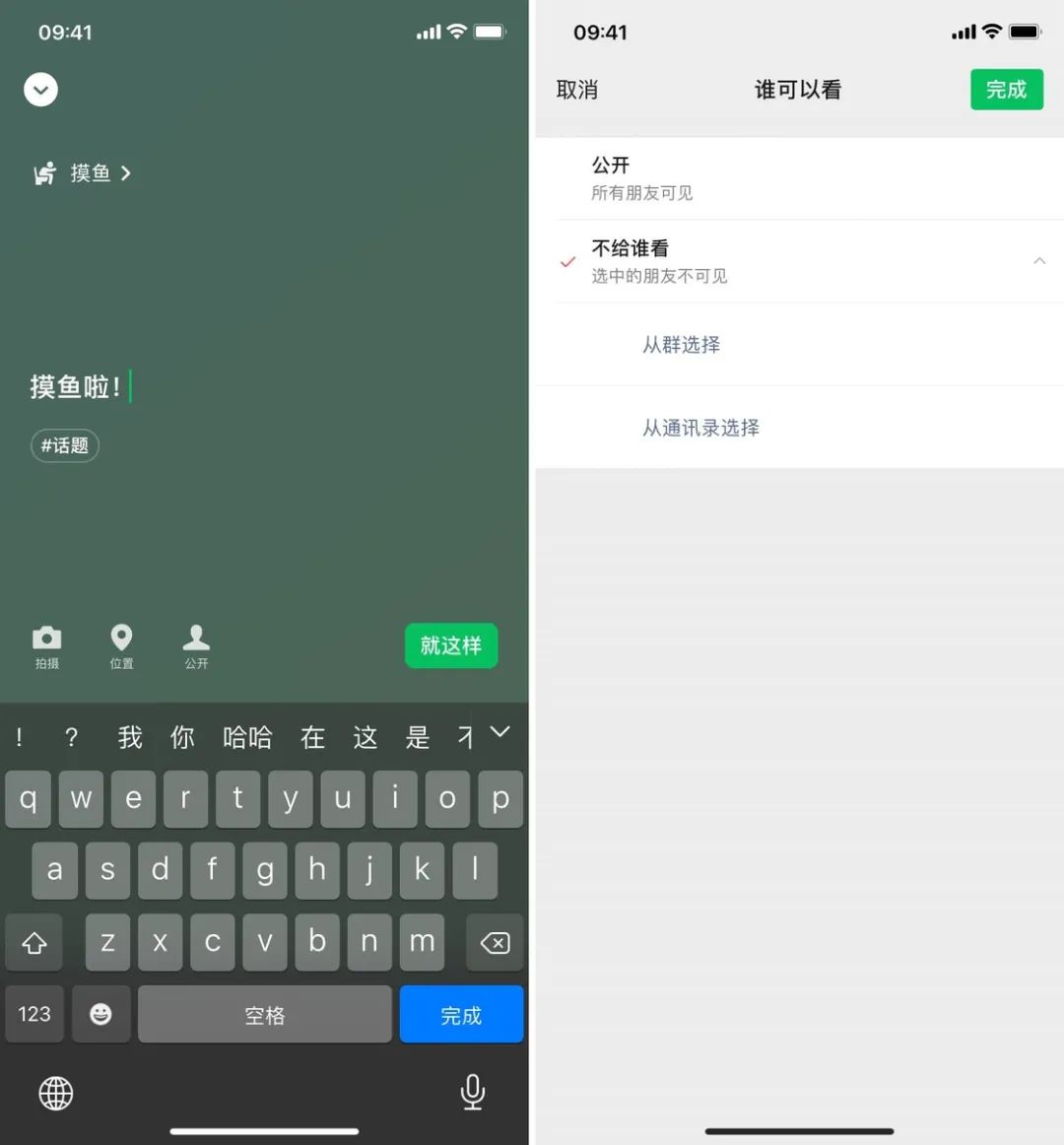 此外,你也可以为状态添加照片、视频、位置和话题,用来丰富你的状态内容。状态也支持设置访问权限。在添加「摸鱼」状态时,别忘了要屏蔽上司🌚。