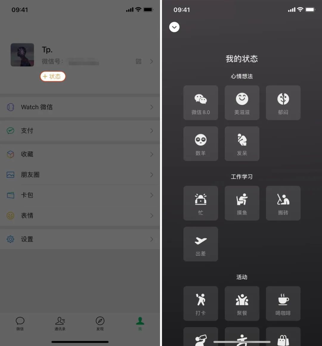 微信 8.0 新增了「我的状态」功能,你可以将自己当前的状态记录下来,并且展示给你的朋友们。你只需要在「我」中点击微信号下方的「+ 状态」即可添加当前的状态。此功能目前正在逐渐开放给全部用户,部分用户可能暂时无法访问。