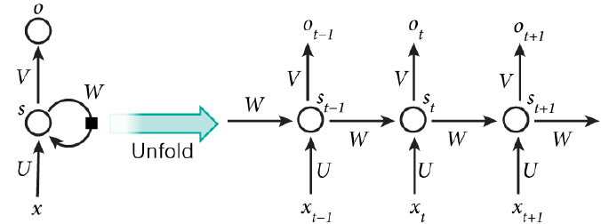 图5.1显示了怎么把一个 RNN 展开成一个完整的网络。比如我们考虑一个包含5个词的句子,我们可以把它展开成 5 层的神经网络,每个词是一层。RNN 的计算公式如下:
