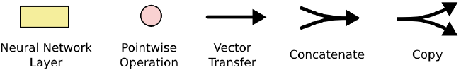 在图 5.8 中,每条有向边代表向量,黄色的方框代表神经网络层,粉色的圆圈代表逐点运算(Pointwise Operation)。两条边的合并代表向量的拼接(concatenation),边的分叉代表把一个向量复制到两个地方。