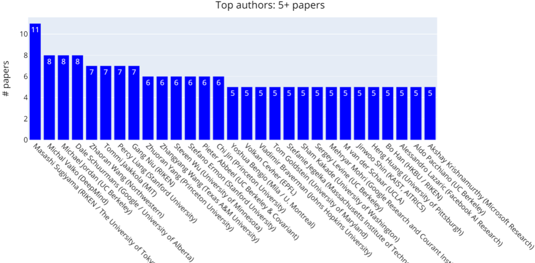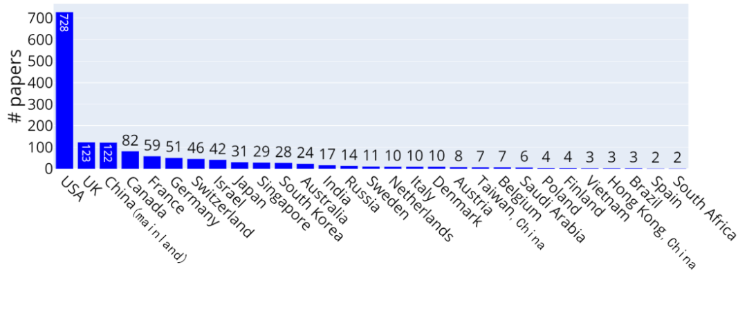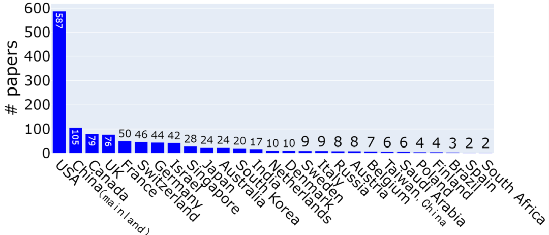 大多数论文有 1 或 2 个组织,但有些论文的撰写有 7 个组织的参与。 两篇有 7 个组织参与的论文分别是:由谷歌、微软、华沙大学、阿姆斯特丹大学、加州大学欧文分校、苏黎世联邦理工学院以及伦敦帝国理工学院的研究者协作完成的《How Good is the Bayes Posterior in Deep Neural Networks Really?》和由蒙特利尔大学、IIIT Hyderabad、麻省理工学院、Mila、特拉华大学以及 LinkedIn 等机构的研究者协作完成的《Learning To Navigate The Synthetically Accessible Chemical Space Using Reinforcement Learning》。 参考链接:https://medium.com/criteo-labs/icml-2020-comprehensive-analysis-of-authors-organizations-and-countries-c4d1bb847fde
