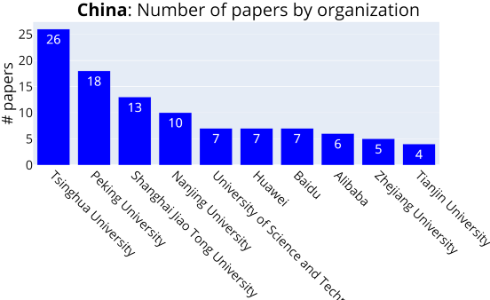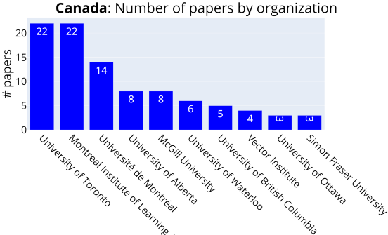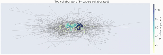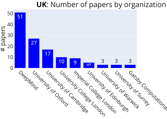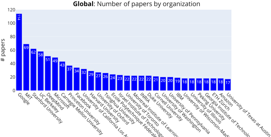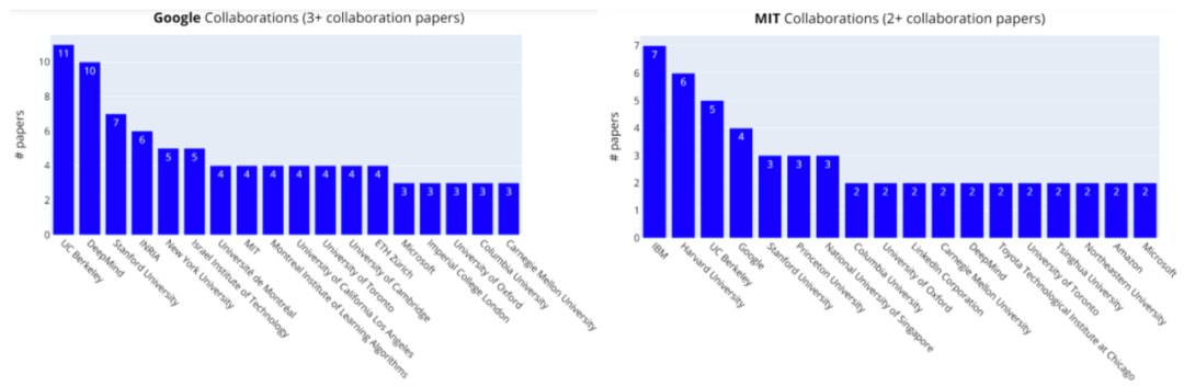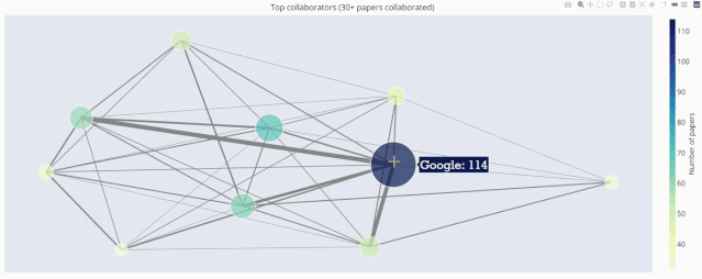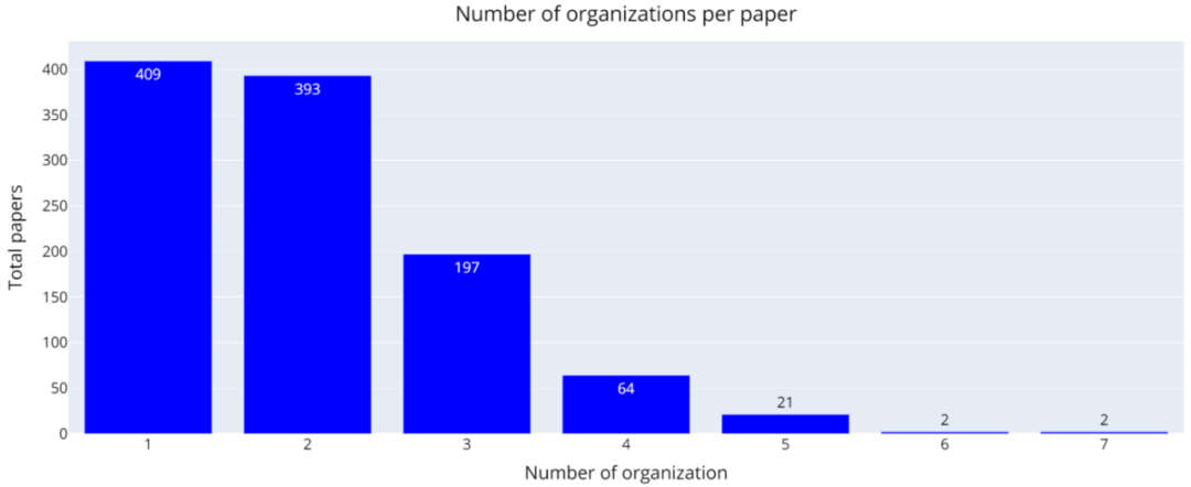 有趣的是,你会发现谷歌与其它公司的协作并不像其与大学之间的协作那么多。而 MIT 有许多工业领域的协作伙伴。 最后,来看一下每篇论文的作者和组织的总数。