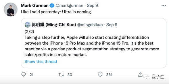 另一位爆料人,彭博社的Mark Gurman转发该内容,并表示15代系列高端款名字会定为Ultral。