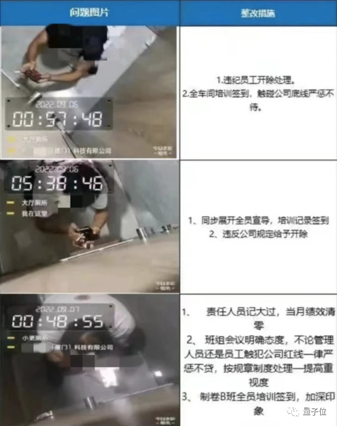 从截图中能看到,员工如厕的相关视频内容被公司作为内部管理证据,相关违规者及上级将面临「签到培训」、「绩效清零」、「开除」等处理。