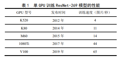 近年来,以机器学习,尤其是深度学习,为 代表的人工智能技术在图像识别[1]、语音识别[2]、 机器翻译[3]和自动驾驶[4]等应用领域都取得了突 破性进展。其原因可以分为三个方面:首先,互 联网、大数据技术的发展,积累了海量的训练数 据,在这些数据中蕴含着丰富的信息;其次,机 器学习理论的发展使得机器学习算法和模型不断 完善,为从训练数据中挖掘有价值的信息创造可 能;最后,GPU 等加速器以及云计算等技术大幅 提升计算性能,大大加快了从数据中获取信息的 速度,使得机器学习技术的应用成为现实。总之, 作为第三次人工智能浪潮的“催化剂”,算力的大 幅提升直接将人工智能再次推向新的繁荣期。高性能的机器学习算法往往具有更高的计算 需求。据 OpenAI 统计,人工智能训练所需要的算 力呈指数级增长,每 3.5 个月翻一倍①。相比之下, 近年来计算引擎的发展速度则远远落后于模型计 算需求的增长。以 Nvidia GPU 发展为例,表 1 展 示了 2012 年以来 Nvidia 的多代 GPU 在训练 ResNet 模型时的性能表现。可以看到近 8 年来, GPU 的计算性能只提高了 16 倍左右,远低于同 期模型计算需求的增长。在“后摩尔定律”时代, 单个计算引擎的性能提升逐渐进入了瓶颈期。面 对日益复杂的计算任务,分布式机器学习被认为 是必然的发展趋势,逐渐成为业界的研究热点[5]。