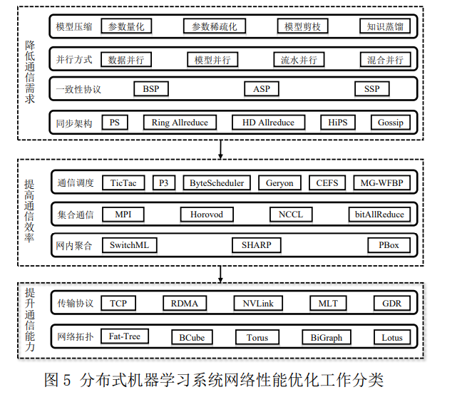 如图 5 所示,为消除(或缓解)网络性能对 分布式机器学习系统扩展性的限制,从本质上来 说,有以下三种根本性思路: