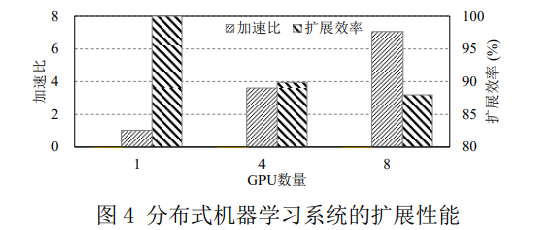对比公式(2)和公式(3)可知,如果在每一轮训 练结束时,将模型参数在所有计算节点间进行同 步,则分布式训练时的模型参数变化和单机训练 完全相同,即分布式训练可以在不改变模型的收 敛性的前提下提高模型的收敛速度。需要说明的 是,在实际应用中,一般是对不同计算节点的梯 度进行汇总,然后使用汇总后的梯度来更新模型 参数,并将新的参数赋给各计算节点的模型副本。相比于单机训练,分布式训练额外引入了节 点之间的数据通信,从而导致分布式训练的速度 无法随着计算节点数量的增加而线性提高。衡量分布式机器学习训练加速效果的指标主要包括加 速比(speedup)和扩展效率(scaling efficiency)。加速比是指同一机器学习训练任务在单机训练和 分布式训练时所需时间的比值。加速比越大,分 布式训练的加速效果越显著,也就是说,可以更 快地完成训练任务。需要注意的是,加速比有可 能出现小于 1 的情况,此时分布式训练速度反而 不及单机训练。扩展效率是指加速比和计算节点 数量的比值。扩展效率越高,各计算节点的计算 资源利用率也就越高。图 4 展示了利用 Nvidia Tesla V100 GPU 训练 BERT 模型时加速比和扩展 效率随 GPU 数量的变化,可以看出加速比和扩展 效率的变化趋势并不相同。一般来说,随着节点 数量的增多,扩展效率呈下降趋势,而加速比则 呈先升后降趋势。加速比在节点数量增多时反而 下降,是由于参数同步引入的通信开销抵消了新 增节点带来的性能收益。