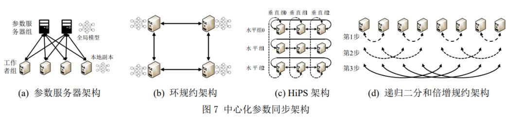 除模型一致性协议外,参数同步架构对大规 模分布式机器学习系统的性能也有至关重要的影 响。参数同步架构是指不同计算节点上的模型更 新进行汇总,并对模型副本进行更新的方式。按 每次模型更新是否推送给所有其他计算节点,参 数同步架构可以分为中心化架构和去中心化架 构;按模型更新是否在单一逻辑节点汇总,可以 分为集中式架构和分布式架构。一般来说,中心化架构既可以是集中式架构,也可以是分布式架 构;而去中心化架构一定是分布式架构。目前常 用的参数同步架构大多为中心化架构,因此,除 特别说明外,下文所提到的参数同步架构均为中 心化架构。