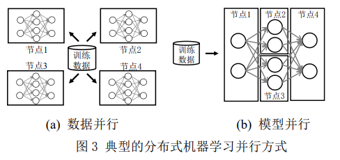 分布式机器学习的并行方式主要包括数据并 行(Data Parallelism)和模型并行(Model Parallelism)。如图 3 所示,数据并行是指每个计算节 点上均具有同一机器学习模型的副本,但不同计 算节点分配到的训练数据是不同的,不同计算节 点间需要将各自的模型更新进行同步,以保证机 器学习模型的全局一致性。模型并行则是将机器 学习模型划分为多个子模型,并分别部署在不同 计算节点上,训练数据统一输入,前一节点完成 子模型计算后将计算结果传递给后一节点继续对 该训练样本进行处理。数据并行由于操作简单, 且不同节点的计算负载比较均衡,应用最为广泛。目前,TensorFlow[13]、Pytorch[14]和 MXNet[15]等主 流机器学习框架均对数据并行提供了支持,并且 具有极好的易用性,但模型并行仍需要用户手动 对模型进行划分和分布式部署。