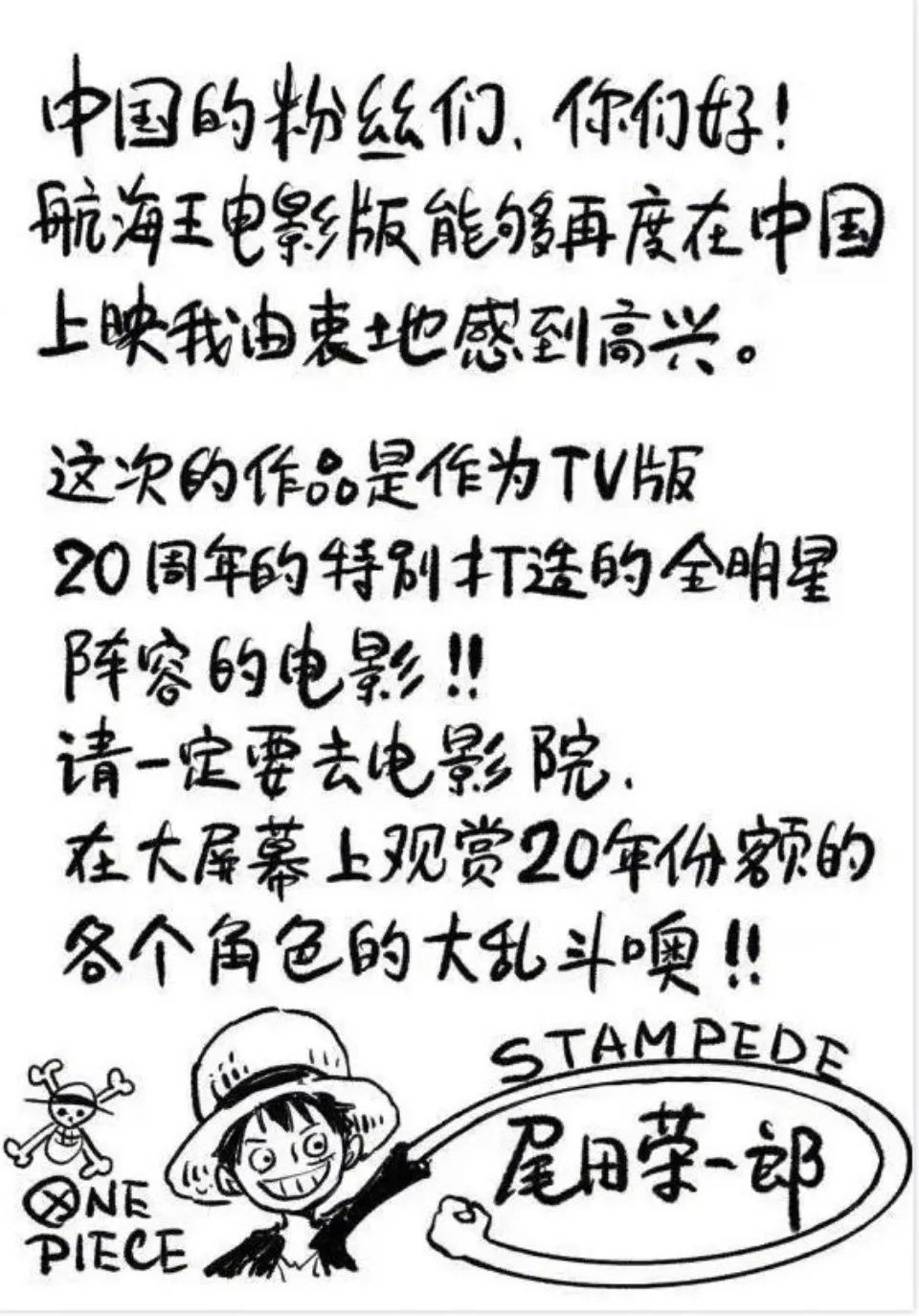 尾田大大还专门给中国粉丝们