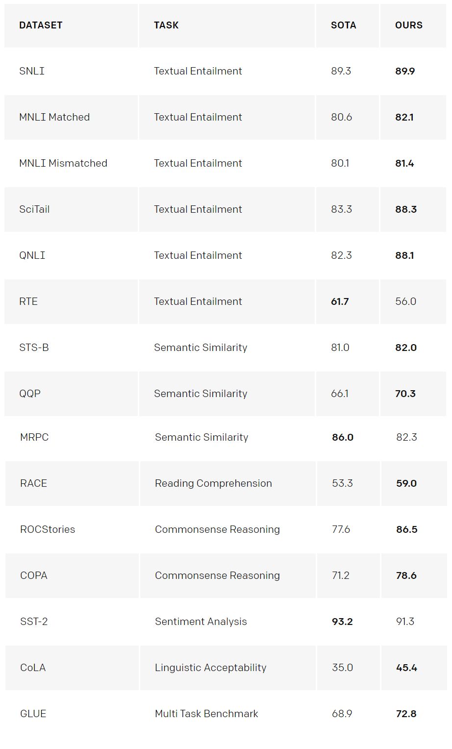 OpenAI 只需要很少的调整就能实现最后的结果。所有数据集都使用单一的前向语言模型,且不使用任何集成方法,超参配置也与大多数研究成果相同。