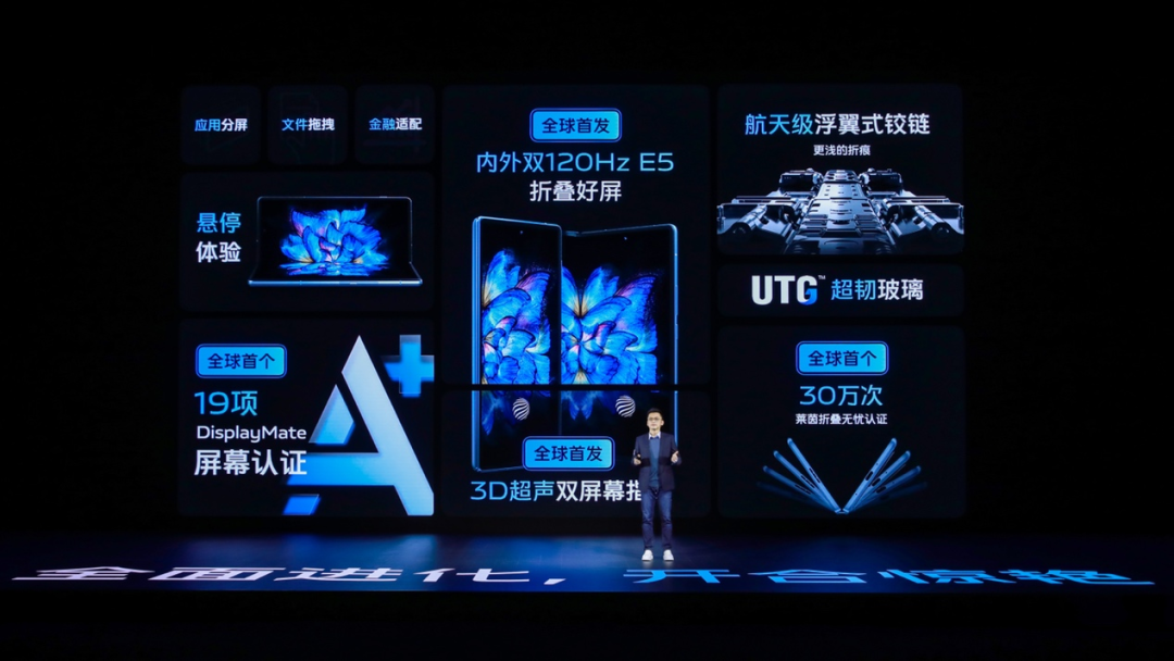 在部分产品上没能出现的,以抗压耐用为特点的UTG玻璃,在vivo X Fold身上也出现了,配合业内最小的水滴半径(2.3毫米,行业常见为3毫米),以及浮动的锆合金中板设计,在屏幕舒展开时,能够起到向上托起屏幕凹痕的作用,朝“完全平整”的屏幕也更近了一点。