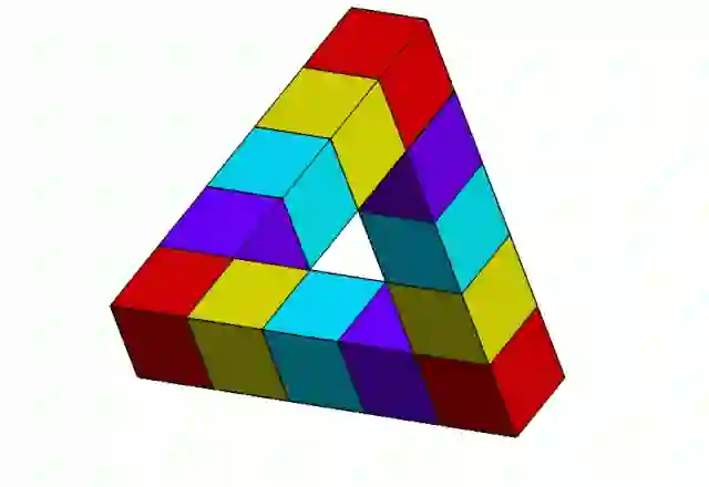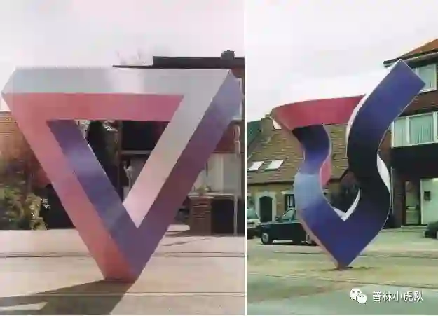 彭罗斯三角可以利用视觉错觉来“实现”。比如下图中位于澳大利亚珀斯的这个雕塑,从特定方向看就是彭罗斯三角。