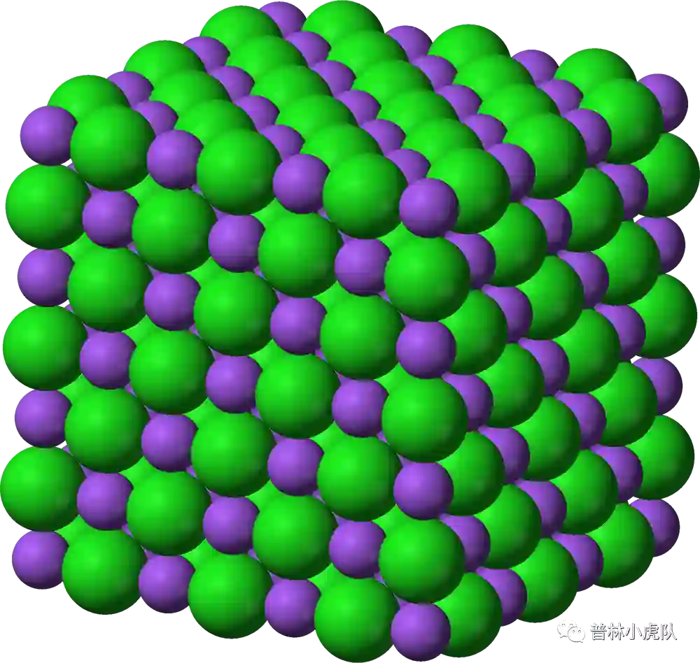 在食盐的晶体结构里,我们可以看到正方形铺满平面的方式,每个正方形的顶点处是一个氯原子或钠原子。