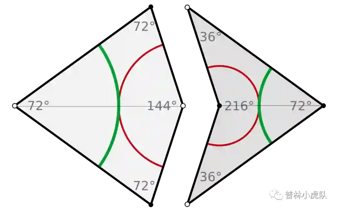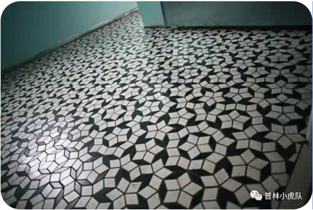 彭罗斯在上世纪七十年代发现了彭罗斯镶嵌。这里的地板砖是两种不同形状但具有同样边长的菱形。一个菱形的四个角的角度分别是36°,144°,36°,144°,另外一个菱形的四个角度分别是72°,108°,72°,108°.