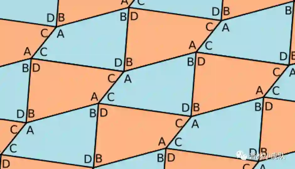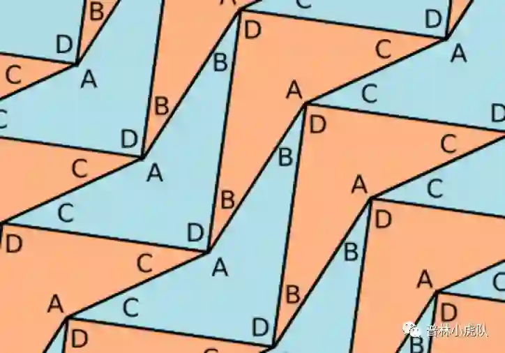 前面几种铺满平面的方式都是周期性的,意思就是可以把所有地板砖朝某个方向平行移动一段距离,得到的铺法跟原来的还是分毫不差。比如方形的铺法,可以沿水平方向平移一个方格边长的距离,也可以沿竖直方向平移同样的距离,得到的铺法跟原来的一样。