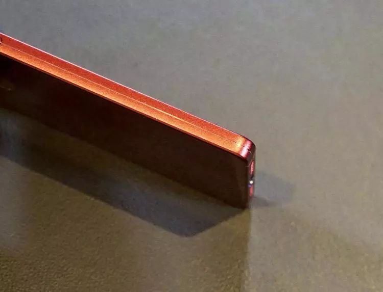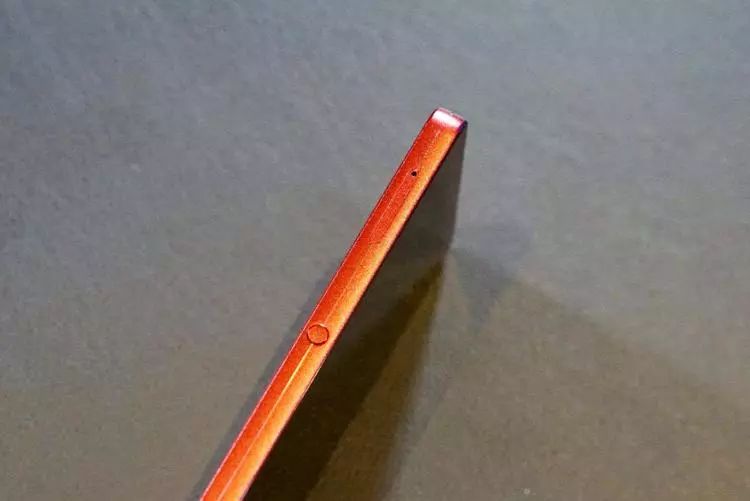 不同的是,坚果 Pro 2 在金属中框的中间,又用 CNC 切了一个小小的凹槽(凹槽比较浅,不容易摸出来),凹槽表面进行了二次的阳极氧化,颜色、质感和中框主体形成了一定的反差。这条金线贯穿整个金属中框,把中框在视觉上切割成了上下两个部分,从视觉上看,这条贯穿中框的金线则有助于在让手机看上去比实际厚度(坚果 Pro 2 的厚度为 7.4 毫米)更薄。