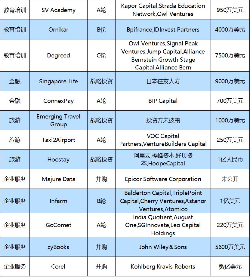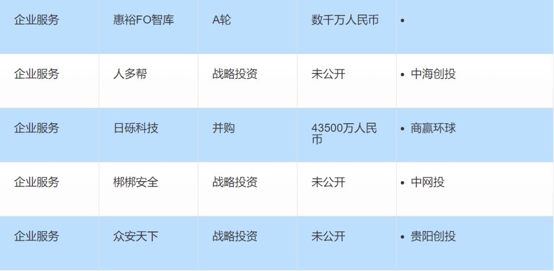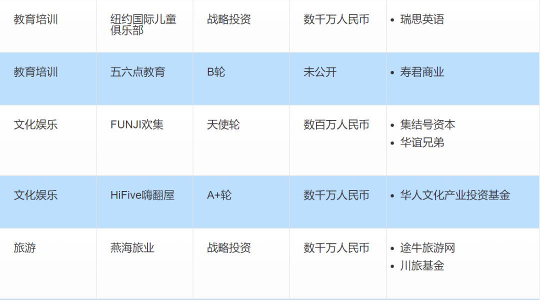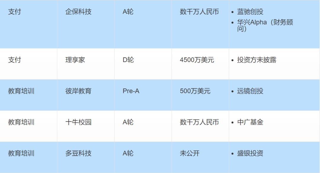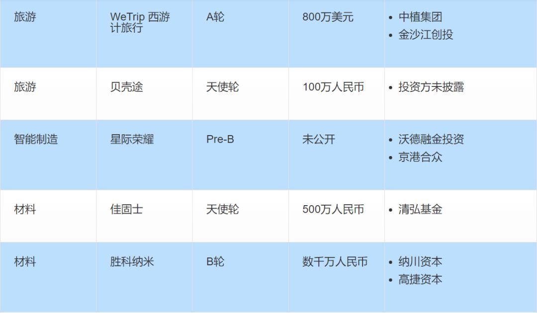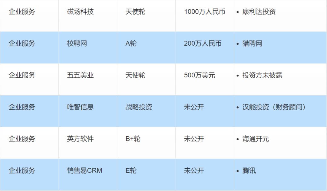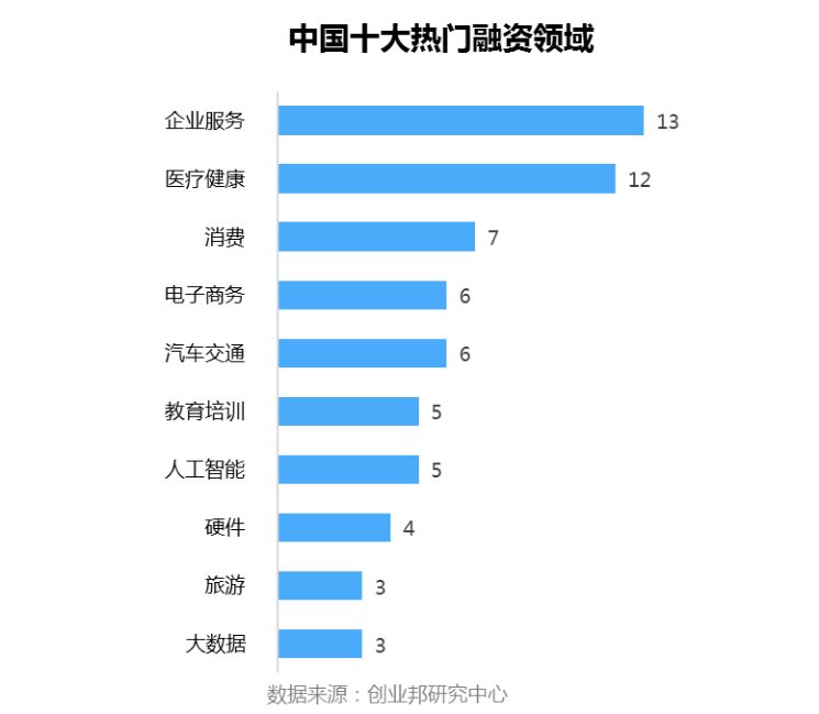 本周披露融资事件涉及25个行业领域,其中融资案例数最多的五大行业分别是:企业服务13起,医疗健康12,消费7起,电子商务、汽车交通并列6起。