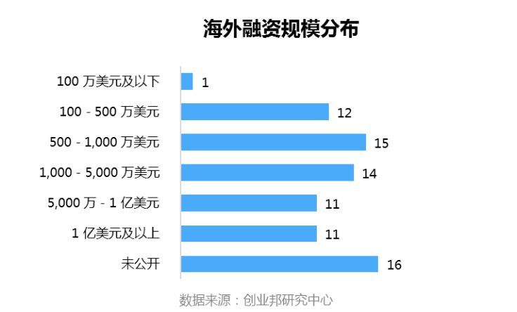 本周国外融资事件的融资规模主要集中在500-1000万美元,共15起。融资额达1亿美元以上的案例有11起。