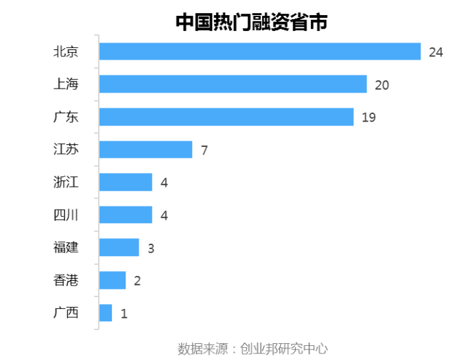 北上广融资事件共计63起,占比69.23%,除此之外,获得融资较多的省市有江苏。