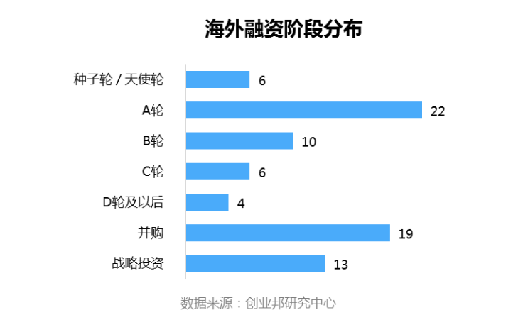 本周国外融资事件的融资轮次主要集中在A轮、并购、战略投资,其中A轮事件最多,22起;并购次之,19起,战略投资第三13起。