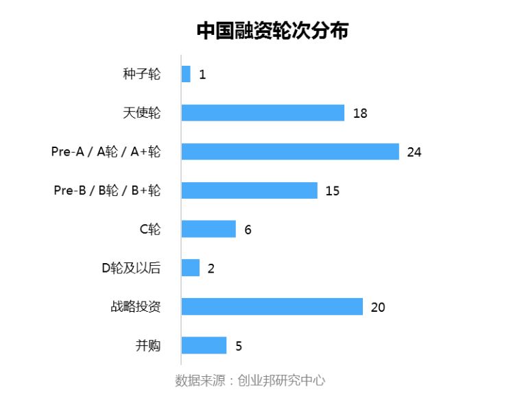 本周融资事件的融资轮次主要集中在天使轮、A轮、战略投资,其中A轮事件最多,24起,战略投资次之,20起,天使轮第三,18起。