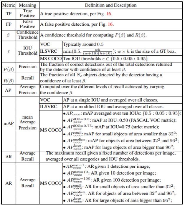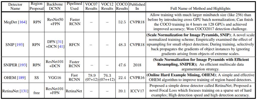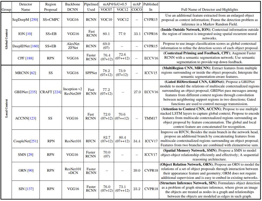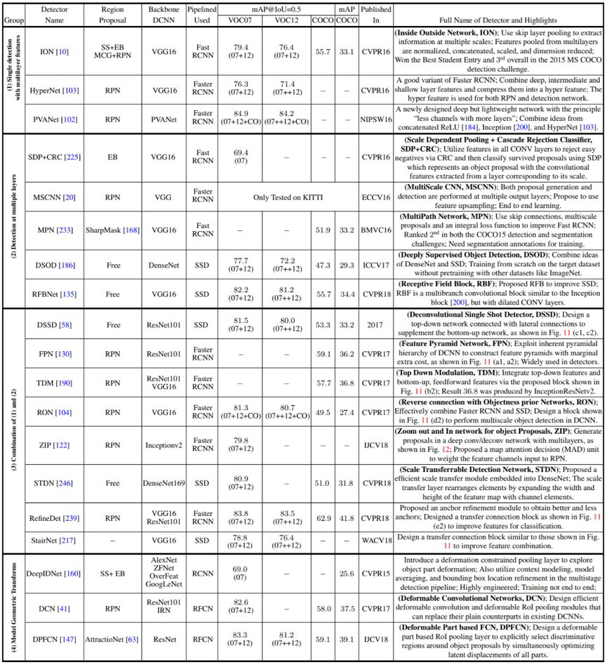 表 3:在改进用于一般目标检测的 DCNN 特征表示中的表征方法的特性总结。详细讨论参见 4.1.2 节。缩写:Selective Search(SS)、EdgeBoxes(EB)、InceptionResNet(IRN)。mAP@IoU=0.5 时,在 VOC07、VOC12 和 COCO 上报告的检测结果;另一列在 COCO 上的结果是在一个新指标 mAP@IoU=[0.5 : 0.05 : 0.95] 上报告的,这是在从 0.5 到 0.95(写成 [0.5:0.95])的不同 IoU 阈值上平均求取 mAP。训练数据:07 表示 VOC2007 trainval,12 表示 VOC2012 trainval,07+12 表示 VOC07 和 VOC12 trainval 的并集,07++12 表示 VOC07 trainval、VOC07 test 和 VOC12 trainval 的并集,07++12+CO 表示 VOC07 trainval、VOC07 test、VOC12 trainval 和 COCO trainval 的并集。COCO 检测结果是在 COCO2015 Test-Dev 上报告的,只有 MPN [233] 除外,其结果基于 COCO2015 Test-Standard。