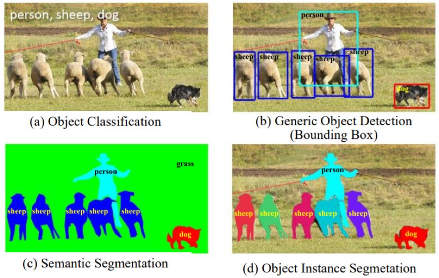 图 3:与一般目标检测相关的识别问题。(a)图像层面的目标分类,(b)边界框层面的一般目标检测,(c)像素层面的形义分割,(d)实例层面的形义分割