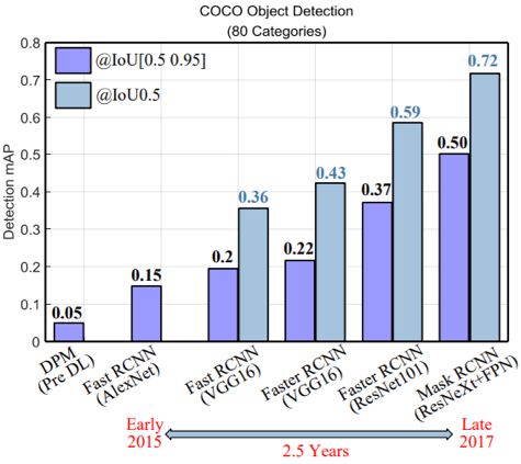 图 17:在 COCO 上的目标检测表现的演进(Test-Dev 上的结果)。这些结果引用自 [64, 80, 176]。在检测中,主干网络、检测器框架的设计和优质的大规模数据集是最重要的三大要素。