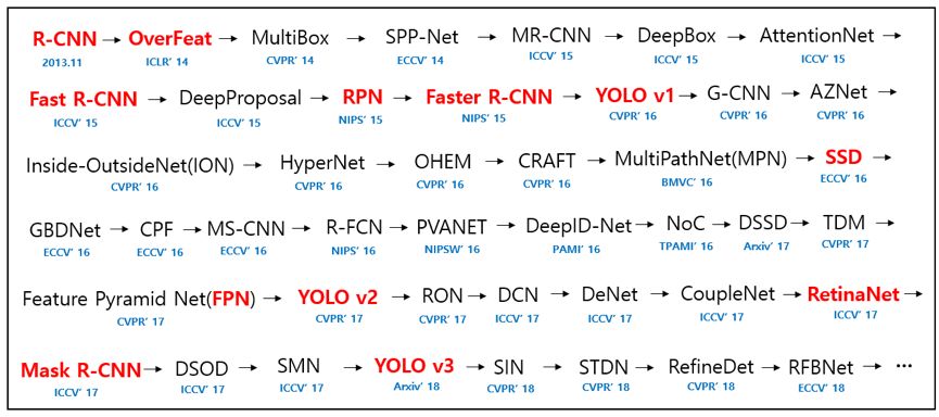 此外,来自首尔国立大学的 Lee hoseong 在近期开源了「deep learning object detection」GitHub 项目,正是参考该论文开发的。该项目集合了从 2013 年 11 月提出的 R-CNN 至在近期举办的 ECCV2018 上发表的 RFBNet 等四十多篇关于目标检测的论文,相当全面。这些论文很多都曾发表在机器学习或人工智能顶会上,如 ICLR、NIPS、CVPR、ICCV、ECCV 等。正如图中红色字体标示的那样,其中也包含了很多代表性的成果,如从 R-CNN 到 Mask R-CNN 的 R-CNN 系列、YOLO 系列、RPN、SSD、FPN 以及 RetinaNet 等。无论对刚入门的机器学习新手,还是想深入研究目标检测的研究者,都是难得的学习、参考资源。