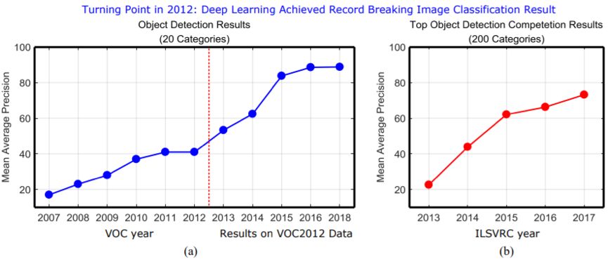图 1:近些年目标检测表现的发展演进。可以看到,自 2012 年深度学习入场之后,目标检测表现(均值平均精度/mAP)提升显著。最佳检测器的表现每年都有稳定的显著提升。(a)在 PASCAL VOC 数据集上的结果:在 VOC 2007-2012 竞赛中获胜方法的检测结果(仅使用竞赛提供的训练数据)。(b)ILSVRC 2013-2017 中最佳的目标检测竞赛结果(仅使用竞赛提供的训练数据)。