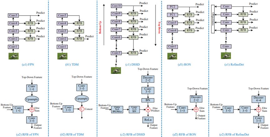 图 11:Hourglass 架构:Conv1 到 Conv5 是 VGG 和 ResNet 等主干网络中的主要卷积模块。比较而言,近期的方法常会用到一些反向融合模块(RFB)。