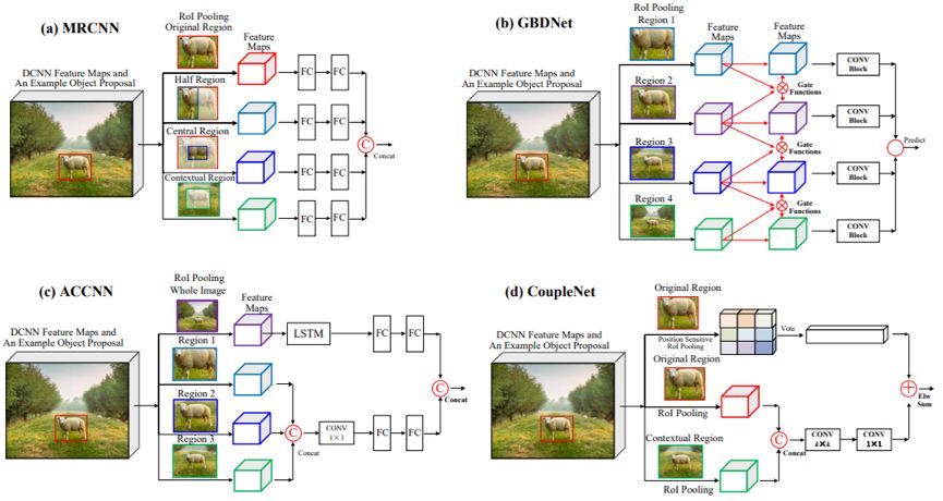 图 13:能探索局部周围形境特征的代表性方法:MRCNN [62]、GBDNet [235, 236]、ACCNN [123] 和 CoupleNet [251],参见表 4
